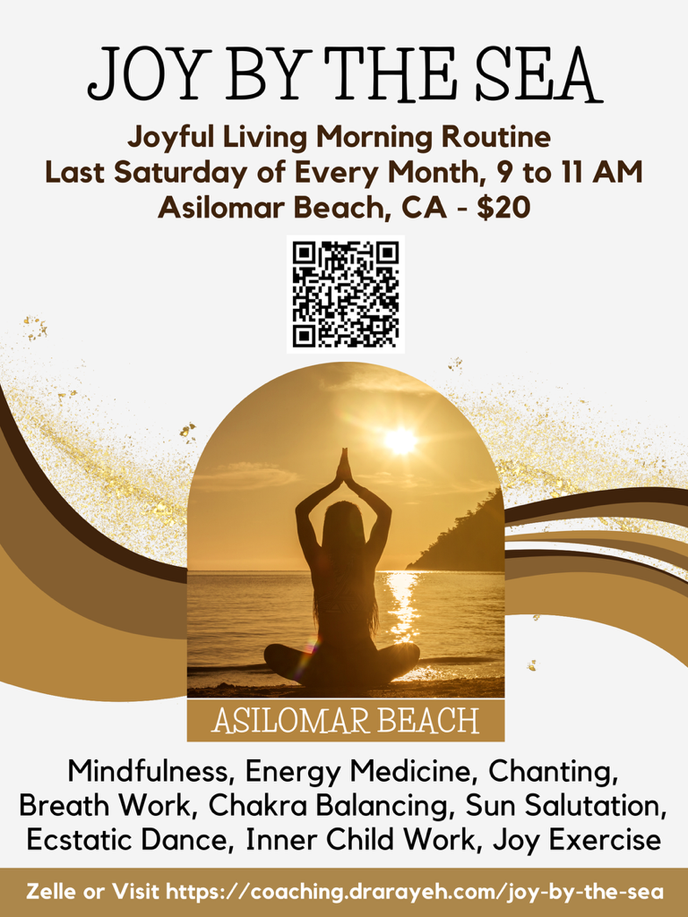 Joy by the Sea is a monthly morning gathering led by Dr. Arayeh, designed to help you reconnect with joy, presence, and inner balance through gentle movement, mindfulness, and heart-centered practices—all set against the natural beauty of Asilomar Beach.